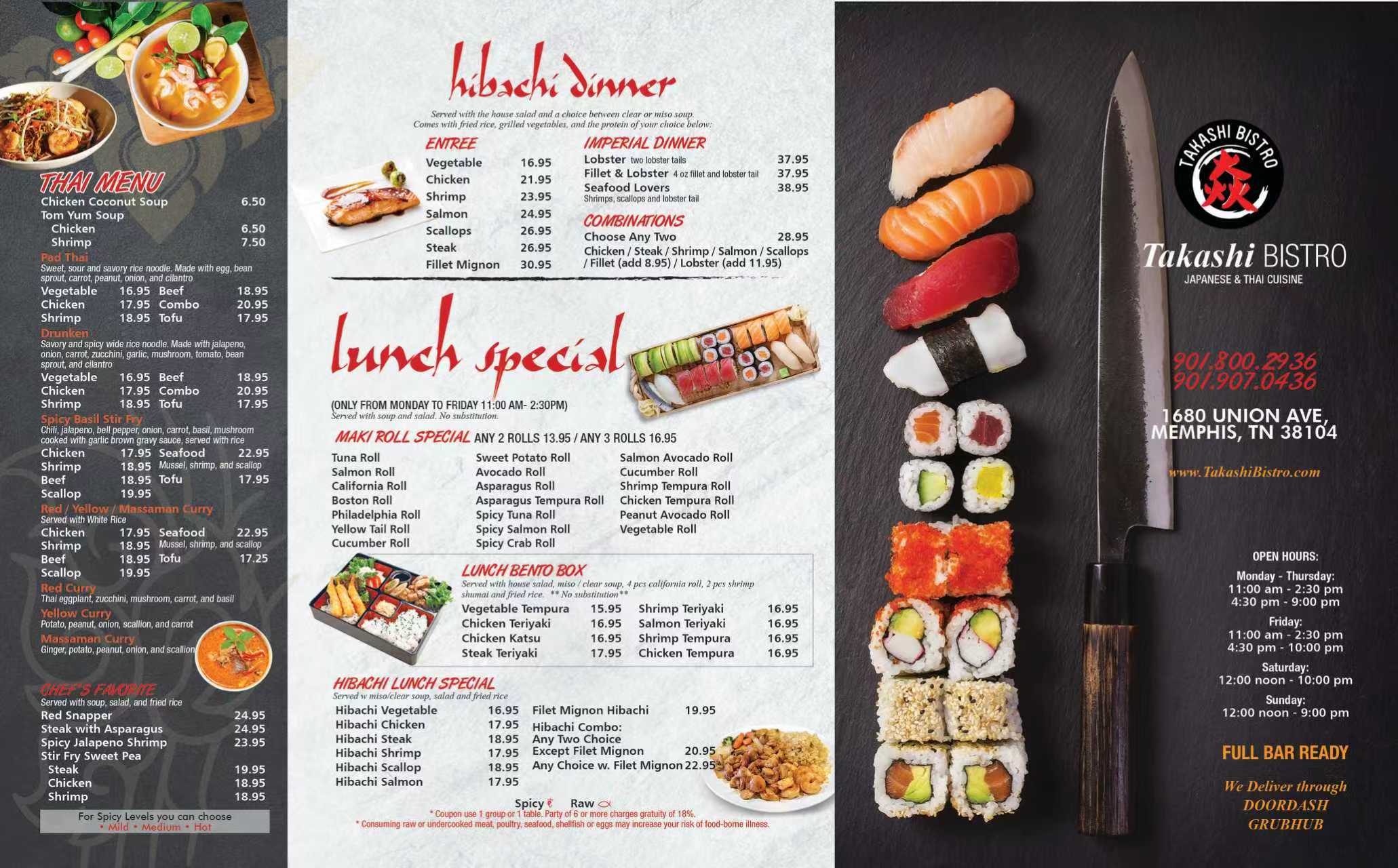 Takashi Bistro at 1680 Union Ave is where flavor meets tradition. Indulge in fresh sushi, sizzling hibachi, and vibrant Thai dishes, all with an Asian fusion twist. Enjoy our lunch specials and bento boxes, or unwind at the bar during happy hour. With a warm vibe and a menu full of delights, we’re here to make your dining experience unforgettable!